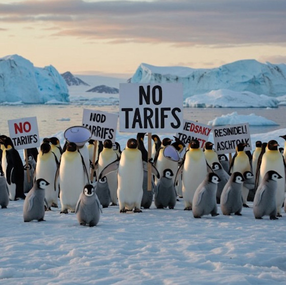 펭귄들이 프랑스어로 'No tarifs'(관세 반대)라고 적힌 패널을 들고 항의 시위를 벌이는 듯한 모습이 담긴 가상의 사진.
